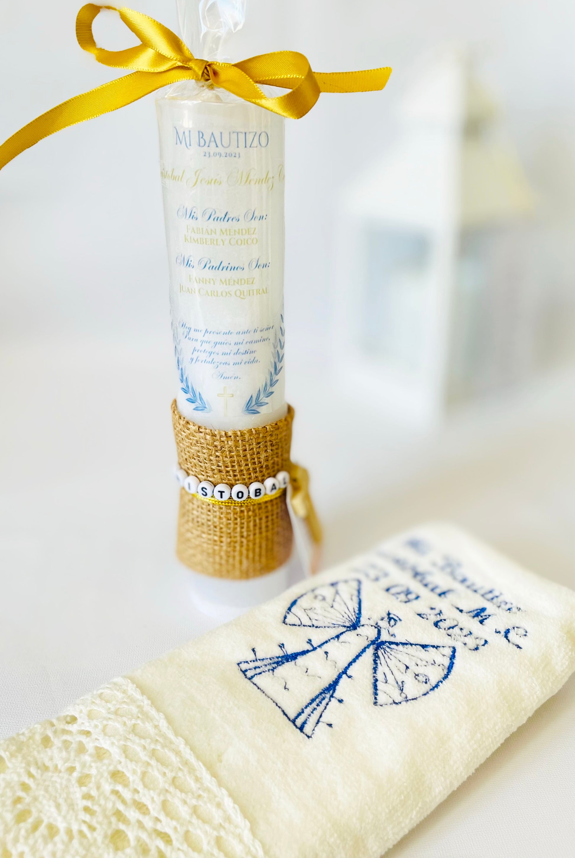 Incluye: Cirio Tradicional personalizado + Toalla bordada, modelo ángel o cruz